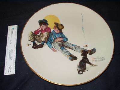 "Disastrous Daring" is the fourth issue in Rockwell's Four Seasons Series-Me and My Pals. Issued in 1975 by Gorham This is the Fall selection. It's 10 1/2" wide and in mint condition. Comes with box. No certificates were issued for these plates. |