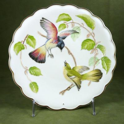 This lovely plate was made by Royal Worcester and is first in a series of 12 plates by artist Dorothy Doughty, entitled Redstarts & Beech. It features a pair of redstarts in a beech tree. The birds and surrounding foliage are raised from the background and are hand painted with wonderful detail. The outer edge of the plate is scalloped and trimmed with gold. It comes in the original box. The plate is in perfect, like new condition, the box shows some wear.