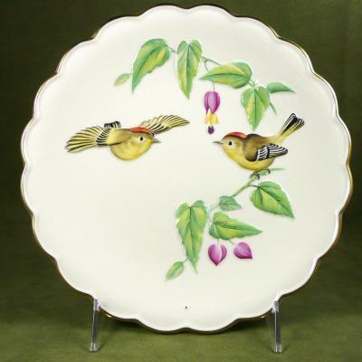 This lovely plate was made by Royal Worcester and is eleventh in a series of 12 plates by artist Dorothy Doughty, entitled Ruby-Crowned Kinglets & Abutin. It features a pair of ruby-crowned kinglets on abutin. The birds and surrounding foliage are raised from the background and are hand painted with wonderful detail. The outer edge of the plate is scalloped with gold trim. It comes in the original box. The plate is in perfect, like new condition, the box shows some wear. |
